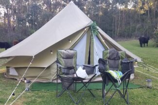 Getting to the next sections of the Great North Walk has now become more challenging; there are few places we can stay indoors, and as the trail goes inland, it’s not possible to leapfrog from train station to train station with our backpacks. Our solution seemed fairly simple, bite the bullet and carry the fully loaded packs five kilometers and then get a ride to the Noonaweena Resort from one of the resort’s employees. After all, how difficult could a few miles be? While Pat moved quickly and confidently up and down the steep rocky slopes, including stepping through an overblown mess of trees, I moved gingerly and groaned loudly. When we arrived at the end of the short trek I was ecstatic. We arrived a few hours ahead of our scheduled ride but no matter; I read, Pat did a few crosswords and we walked about. At 2:45 p.m., a red Suzuki pulled up and Adam got out and introduced himself. Adam manages the Noonaweena Resort, where we had managed to reserve their one and only space available to us, a few days earlier; their glamping tent. As Adam steered the vehicle through the two lane roads, we shared plenty of stories. He indicated that the resort often hosts wellness-oriented retreats and during the time we were on site, they were hosting individuals coping with significant tragedies in their personal or professional lives. Adam then drove us down the hill to our lodging, a beautifully situated canvas tent. Inside there were three double beds with flowering spreads, solar lights, rugs strewn on the floor, and plenty of accoutrements; bathrobes, towels, slippers, and a first aid kit. As we set our backpacks inside the tent, several cows made their way toward us.