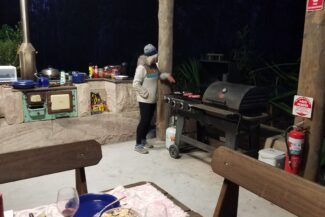 Farther down the hill was an open air structure made of a sandstone base with wood frame construction and a metal roof. This was to be our kitchen, our dining area, and our place for showering. It had electrical outlets , a gas grill, hot water, a toaster, a refrigerator, a microwave , all kinds of dishes and utensils and a tea kettle. Inside the refrigerator, we found steaks, fruit, potatoes, salad, ham and eggs. All we can say is what an amazing experience; the best kind of camping ever. We prepa