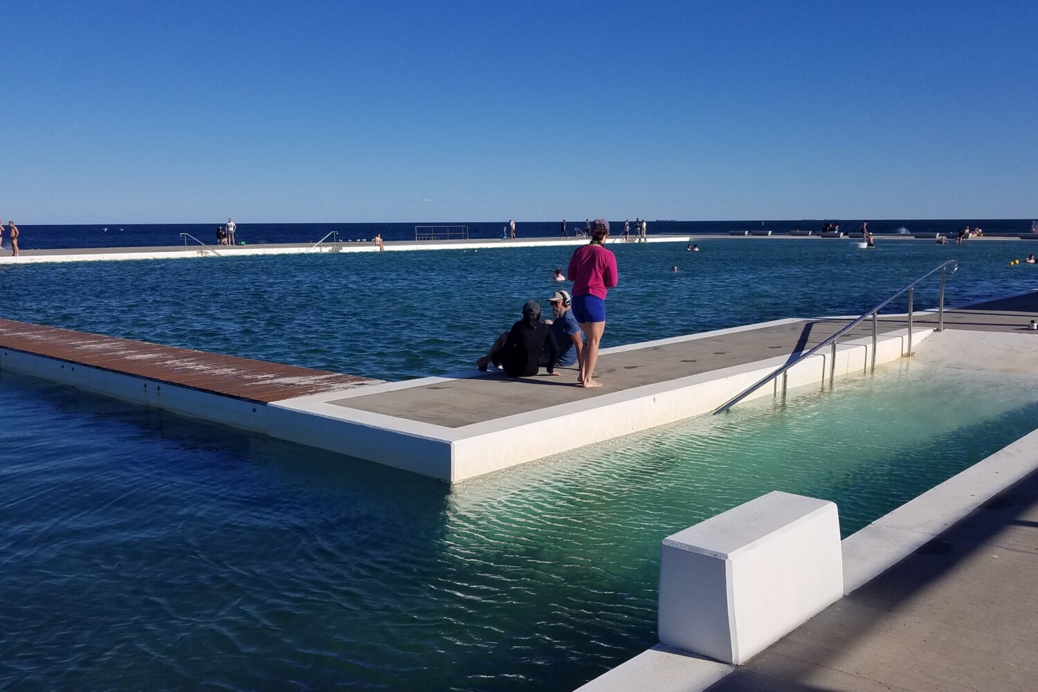 On the last day at Newcastle Beach, we took in the Ocean Baths, sized 200 feet by 200 feet; two large pools with sandy bottoms where the ocean water flows in and out. Though we thought it colder than in the ocean, plenty of people were lap swimming and the young people were having a good time pushing each other in. As we were basking in the sun on the concrete