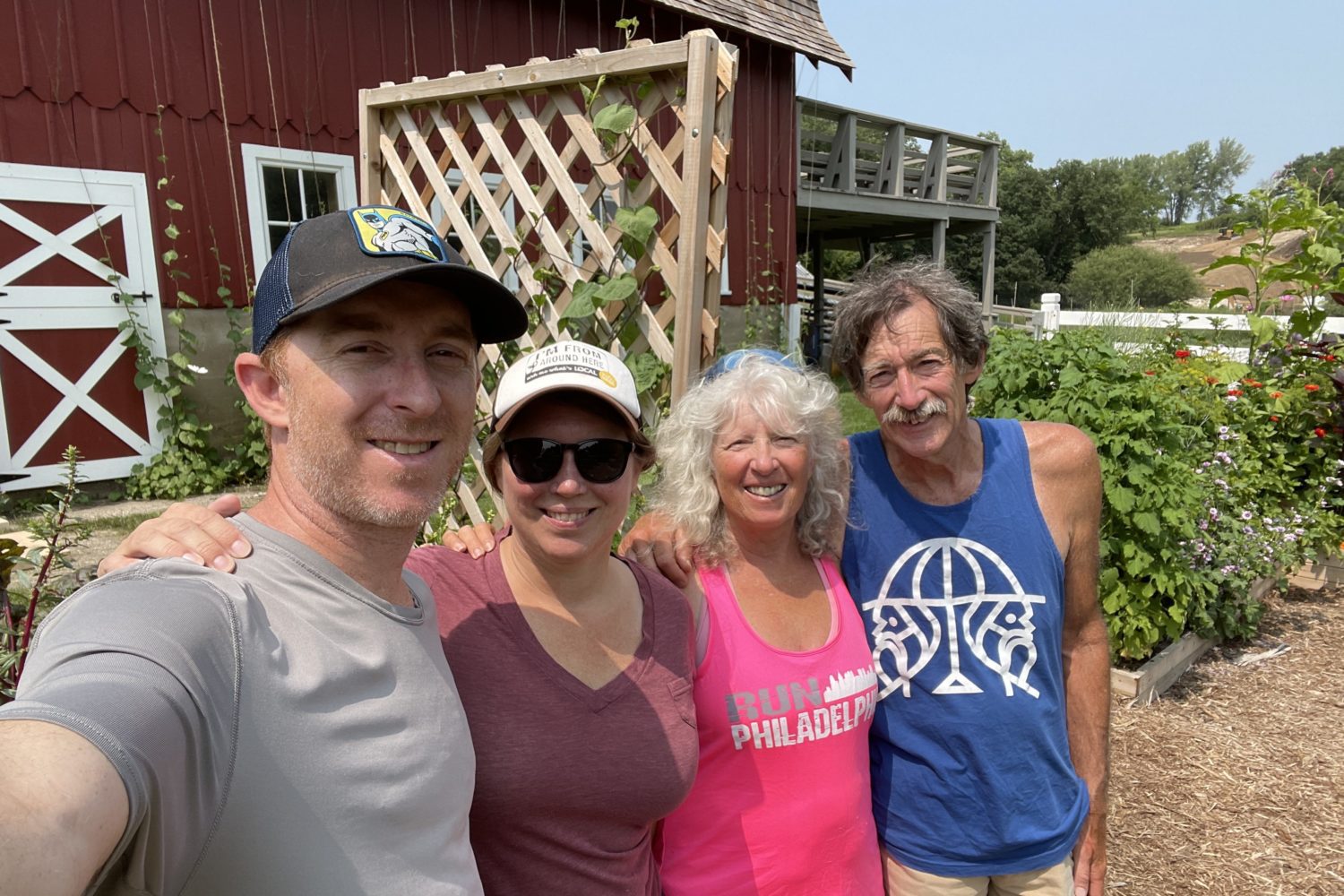 When Pat returned with the wheel now taped so the spokes would no longer pop through, Jerry invited us for pineapple. After we had eaten in his backyard and had the wheel back on my bicycle we continued on trails and country roads into North Judson. There, we were welcomed by Betty, our Warm Showers host, her husband, Paul, and their golden retriever, Cheddar.