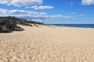It was time to drive south to Phillips Island, about 700 miles away. Pat did the driving and Destyni kept her eye out for kangaroos. This highway (which does allow cyclists) was two lanes only in most places with no dividing barriers and the road wiggled up and down. By 7 p.m Pat was fried so we found lodging at a pub packed with serious dart players all On Tuesday, we scrapped frost from the windshield and headed farther south, stopping once at Lakes Entrance, which has a barrier beach that goes for miles without any development.