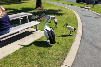 a coach and in less than an hour’s time, she was going from a prone position to standing up and surfing. From there we drove into Melbourne, to visit my second cousin and her family. We had planned to stay with them but because of health issues, our visit took place in the hospital. Later that night, we landed at their home in Shepparton, where their son, John, volunteered to host us for two days. On Friday morning, we explored Shepparton, taking in the city’s art museum, the history museum, the local cows and a walk around Victoria Lake.