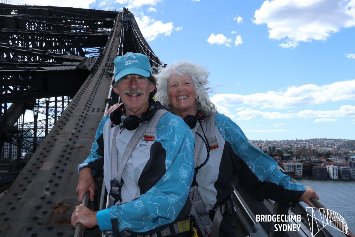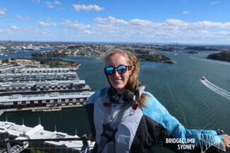 Friday was the day I was the most anxious about – the Sydney Harbour Bridge Climb. It was,I can now say,having survived it, everything it promised to be and more. The system is of preparation and climbing is like a well -oiled machine. First we were each breathalyzed. If one doesn’t pass, they cannot take the climb. After a round of introductions, we were handed grey jumpsuits to put on. Security procedures were next and then we were escorted into a large room equipped with harnesses. We were taught how to step into them, tighten them and then under our leader, Mitch’s tutelage, we practiced climbing forward and backward on metal ladders with our harnesses.
